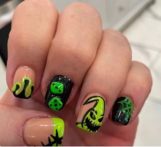 Sarah W. Thank you so much for my awesome Oogie Boogie nails. They are amazing - I especially love the Raised dice. It is so difficult to find a nail place that does amazing art, but you have nailed it every single time - first with my Sally inspired nails and now you have outdone yourself with this set. You have a customer for life! :)